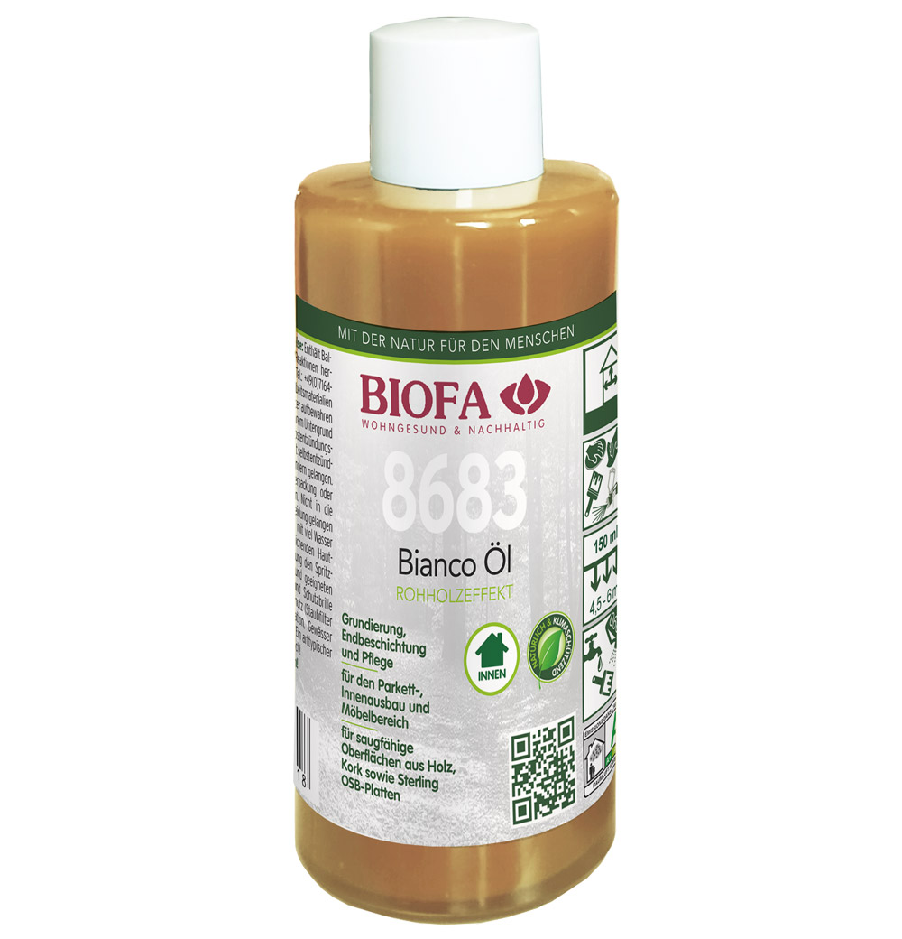 Für die Pflege, Auffrischung und Reparatur von mit Bianco Öl behandelten Oberflächen gibt es das BIOFA Pflegeset Bianco 8081. Damit lassen sich auch kleine Verletzungen und Dellen partiell reparieren.